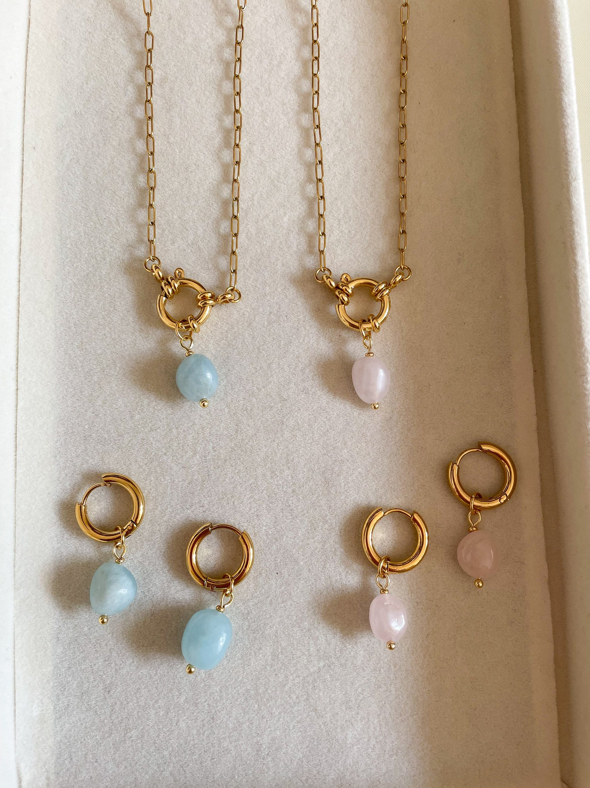 Die passenden Rosenquarz-Ohrringe werden ebenfalls in unserem Shop verkauft. Schau doch mal vorbei!
